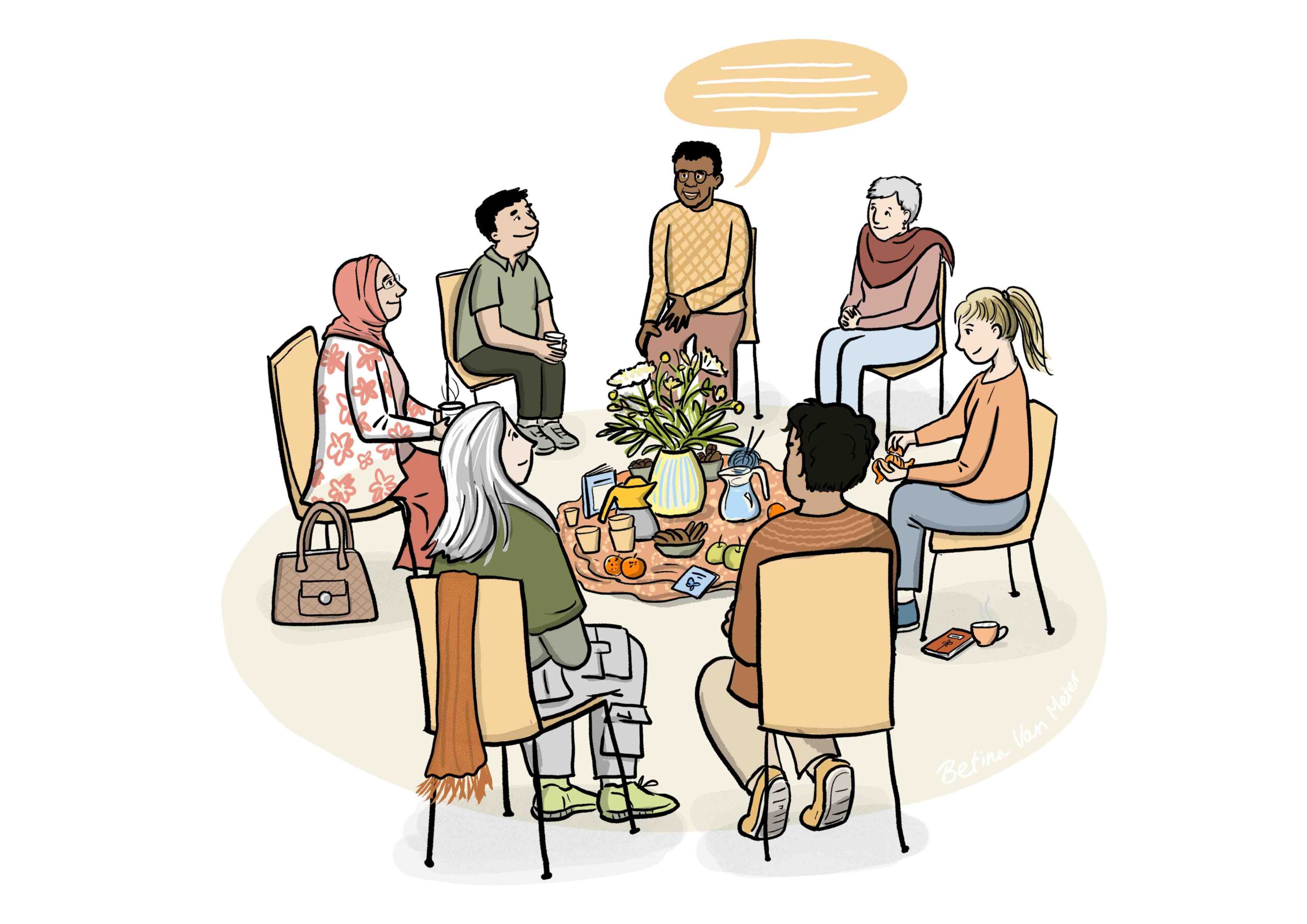 Verhalen die knellen als een steentje in je schoen worden met elkaar gedeeld. Tijdens zo’n bijeenkomst doen we voor de afwisseling ook iets anders dan praten en luisteren: muziek beluisteren, een spelletje doen, een gedicht voorlezen. Iedereen is welkom, ook om alleen te luisteren. Taken zijn:
